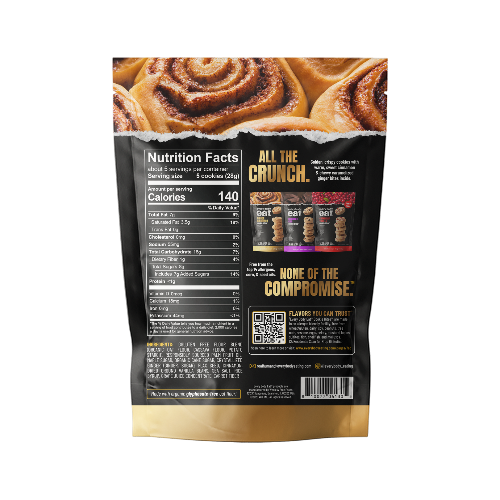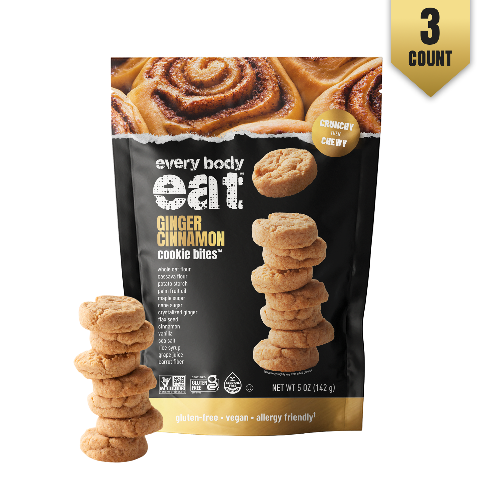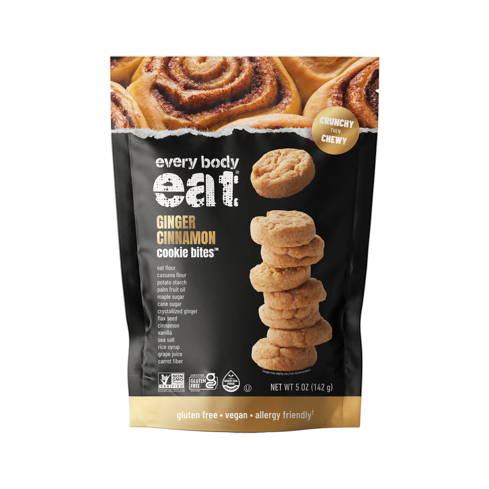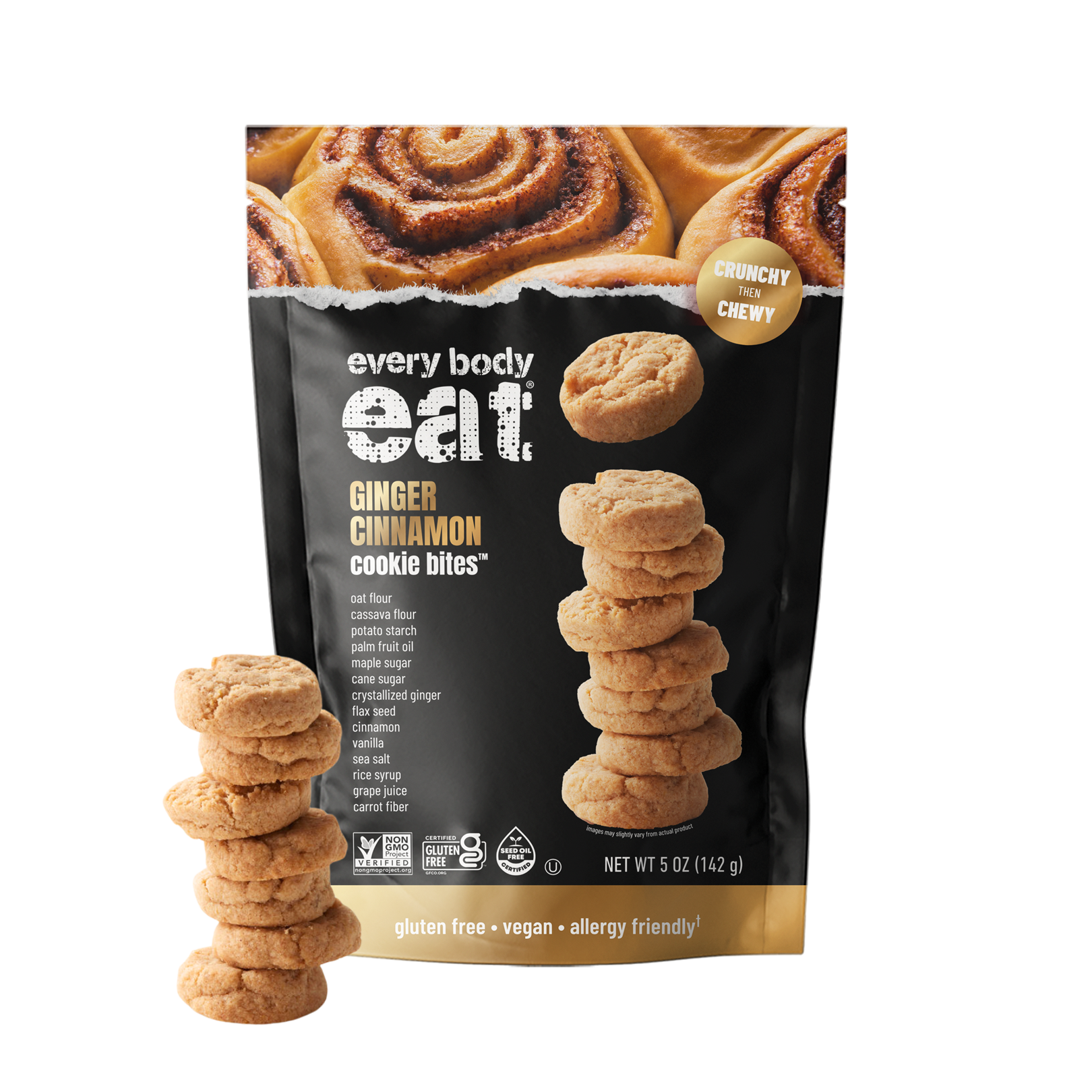 Cozy up to the comforting warmth of Every Body Eat® Ginger Cinnamon Cookie Bites! Each crunchy-then-chewy bite combines the gentle heat of ginger with a touch of sweet cinnamon spice—all from clean, gluten-free ingredients you can trust. Perfect for sharing… or not.