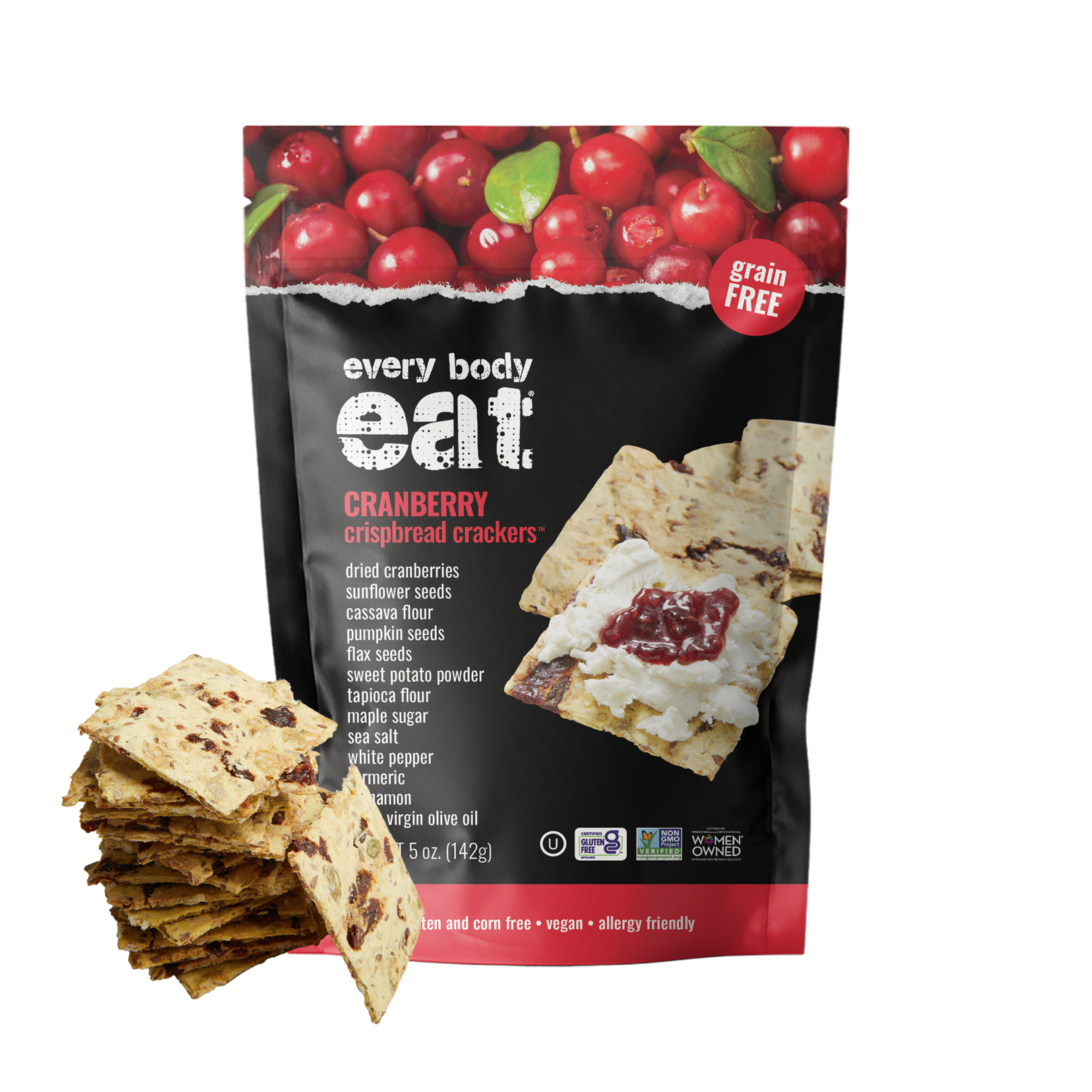 Bright, subtly sweet, and satisfyingly hearty — Every Body Eat® Cranberry Crispbread Crackers blend tart cranberries with savory crunch for balanced, gluten-free snacking that’s as elevated as it is inclusive.