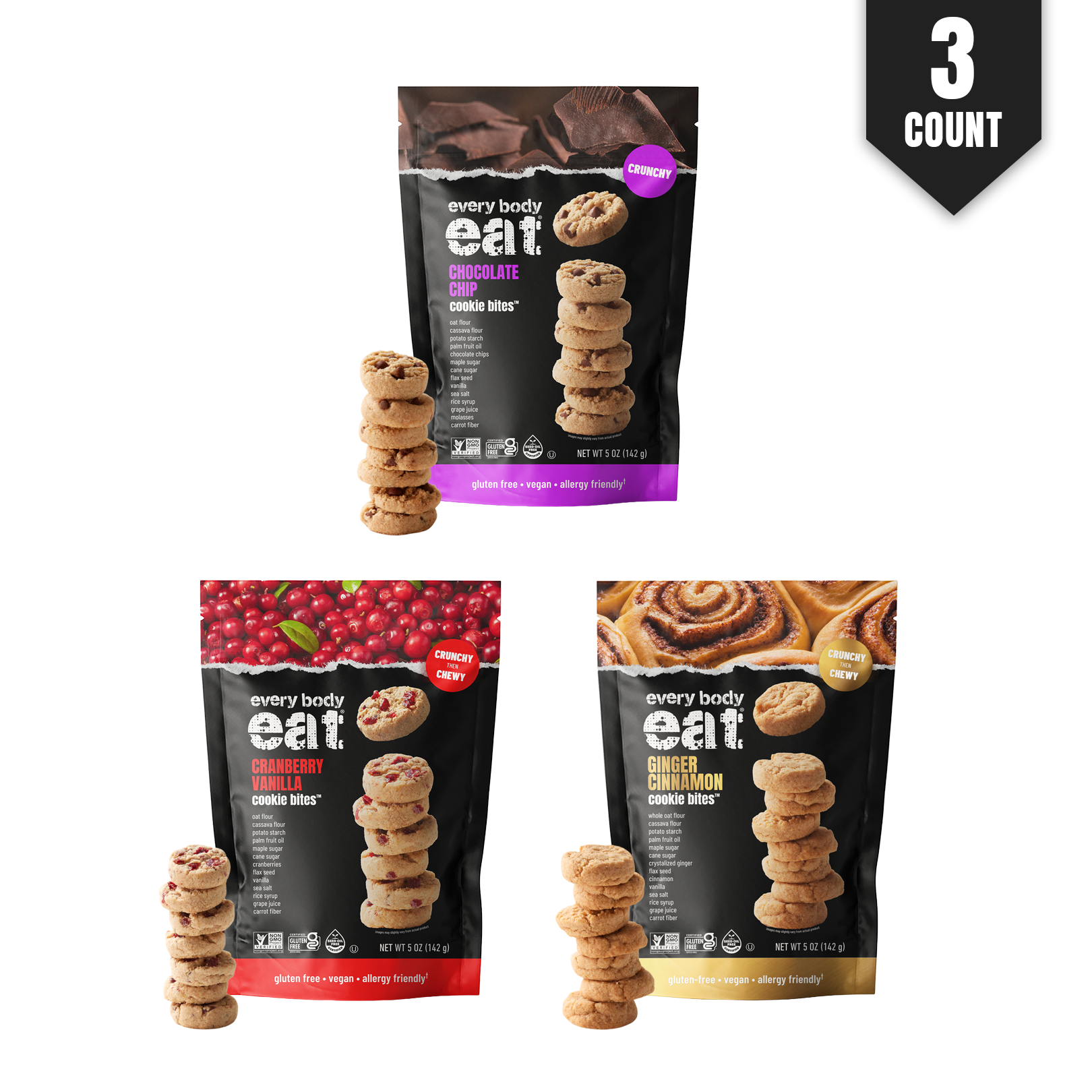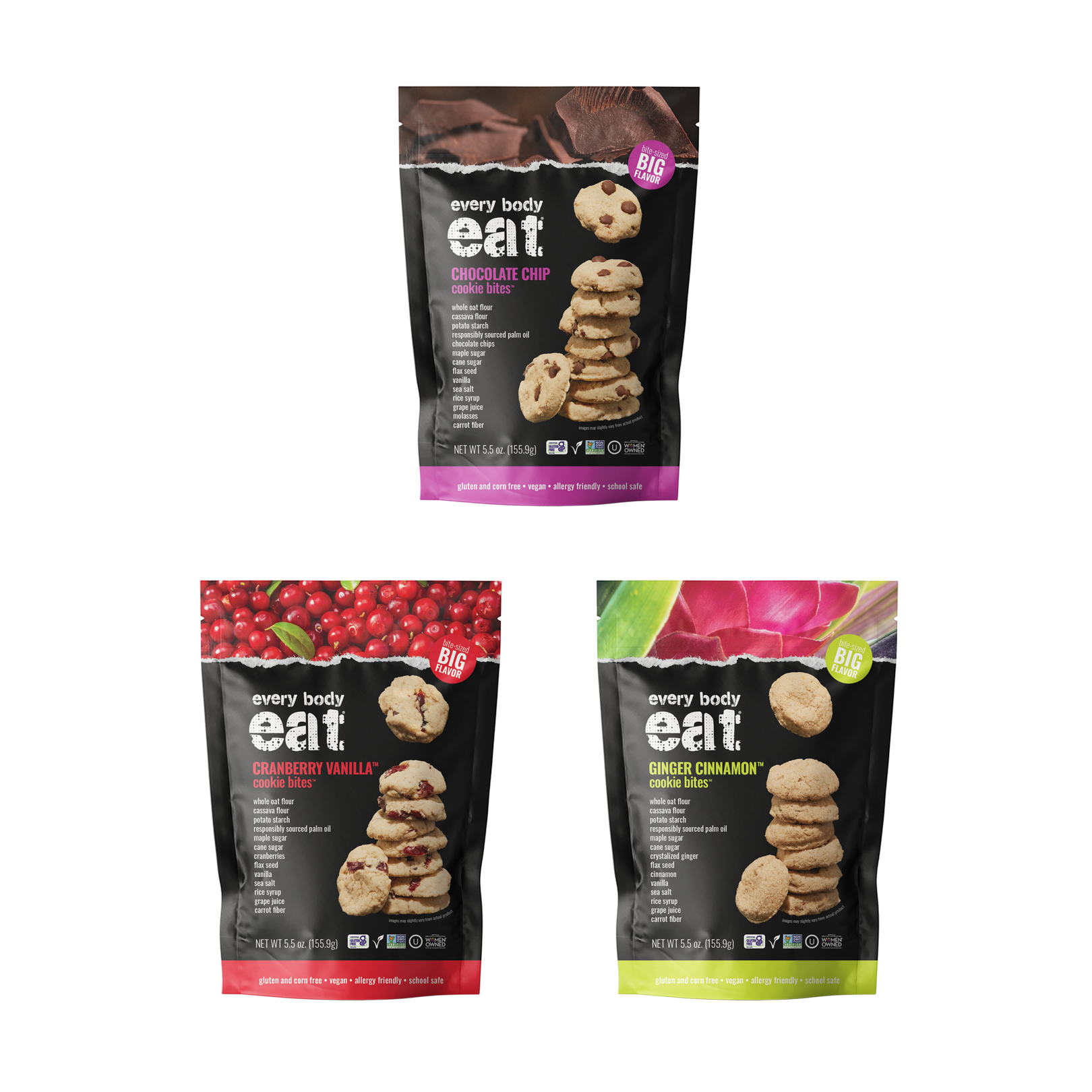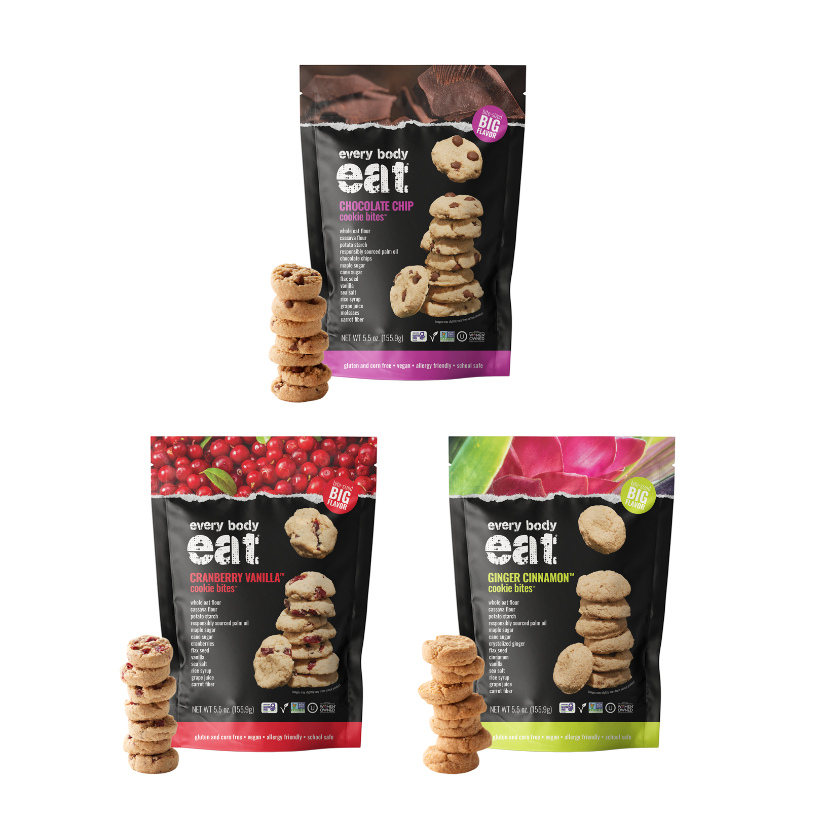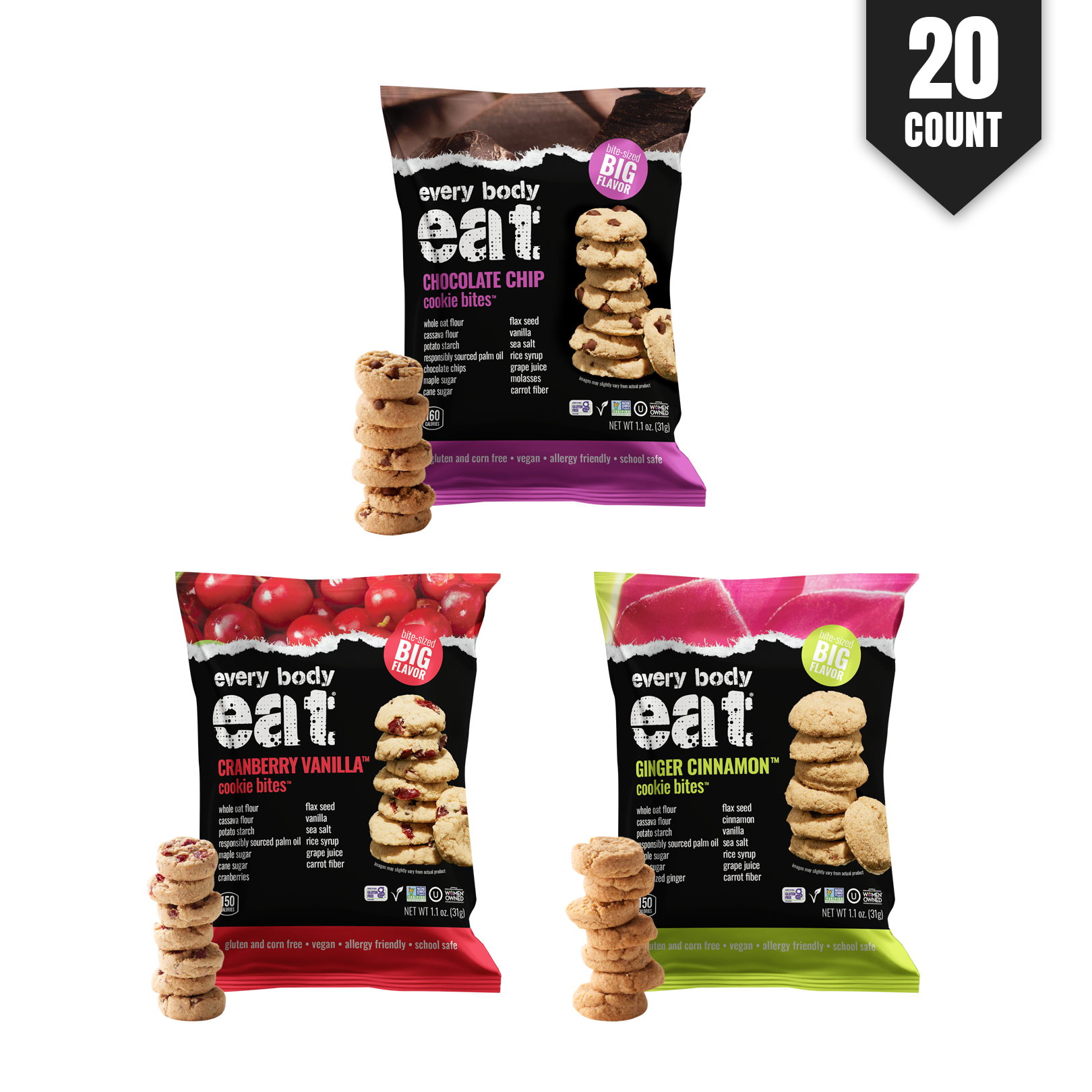 Can’t pick a favorite? You don’t have to. The Every Body Eat® Cookie Bites Variety Pack lets you enjoy all three craveable flavors—Chocolate Chip, Cranberry Vanilla, and Ginger Cinnamon—each crafted for every body to love.